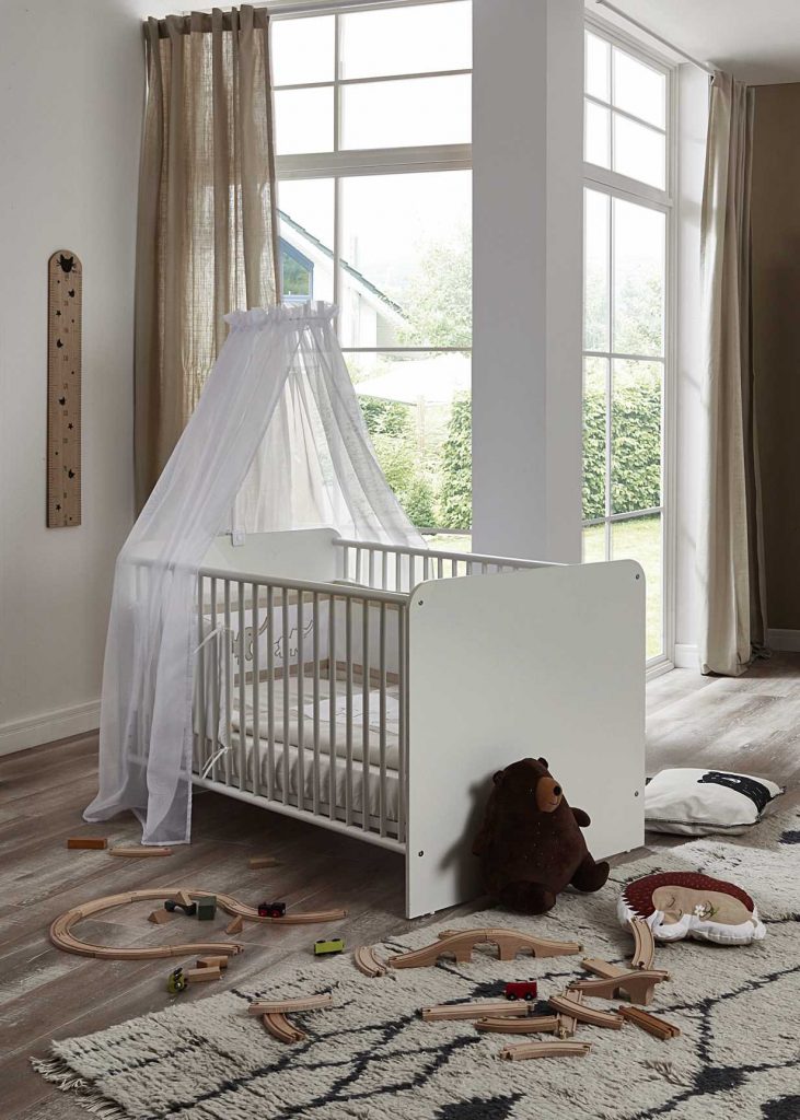 Das schöne Babyzimmer ALIYA 1 in der Farbe weiß stattet das erste Kinderzimmer komplett aus. Das 3-teilige Babyzimmer-Set besteht aus Babybett, Wickelkommode + Wandboard und einem 3-türigen Kleiderschrank. Das Babybett mit einem 2-Fach höhenverstellbarem Lattenrost aus Buche und den speichelfesten Schlupfsprossen schenkt Ihrem Baby einen gesunden Schlaf. Selbstverständlich lässt sich das Babybett auch zum Juniorbett umbauen, die dazu gehörigen Umbauseiten können Sie separat erwerben. Die Wickelkommode mit Seitfallschutz bietet viel Stauraum und lässt sich später als Kommode nutzen. Weiteren Stauraum für Babykleidung, Spielzeug und Babyutensilien bietet der 3-türige Kleiderschrank.