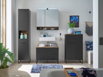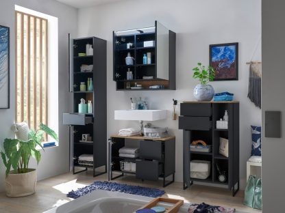 - 1x Waschbeckenunterschrank (B/H/T: 80/60/35 cm), 1 Softclose-Tür, 2 Schubkästen, mit Siphonausschnitt