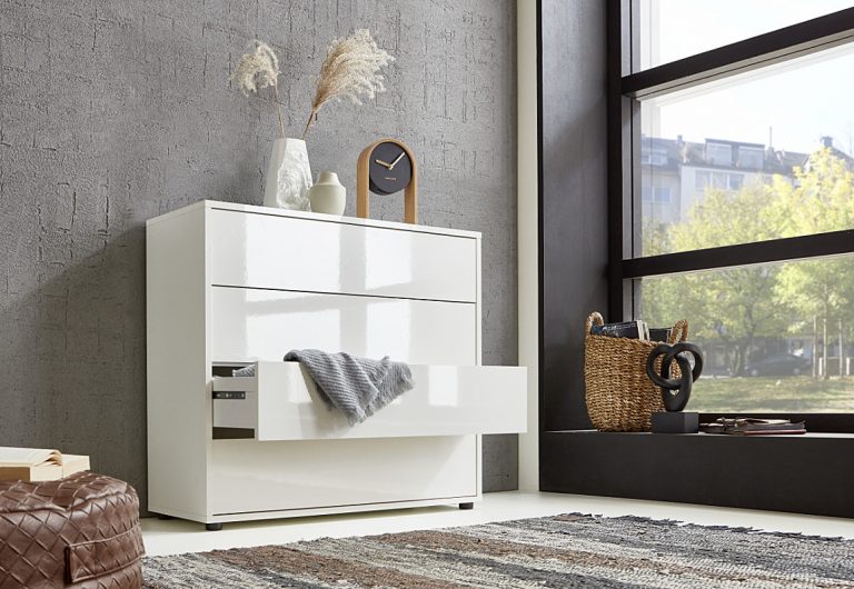Das Sideboard Ben Set 4 bestehend aus Schubkastenkommode (2 Stück) und Türkommode (1 Stück) besticht nicht nur durch das moderne italienische Design, sondern auch durch Ihre Praktikabilität. Durch die Push-to-open Funktion lassen sich die Schubladen und Türen nicht nur einfach öffnen, sie präsentieren sich auch schlicht und grifflos. Dank der schräg montierbaren Einlegeböden können bis zu 16 Paar Schuhe bis Größe 46 staub- und lichtgeschützt in dem Schrank verstaut werden. Alternativ kann die Kommode Ben auch als Aktenschrank genutzt werden, dazu die Einlegeböden einfach gerade einlegen. Ebenfalls enthalten im Set ist die Schubkastenkommode Ben, in welche aufgrund der breiten Schubkästen problemlos jedes Teil verstaut werden kann – egal ob Bücher im Wohnzimmer, Spielzeug im Kinderzimmer oder die Wäsche im Schlafzimmer. Die Serie Ben lässt sich wie ein Baukastensystem beliebig oft erweitern und verleiht Ihrem Zuhause mit der schlichten und grifflosen Hochglanzfront ein besonderes Flair.